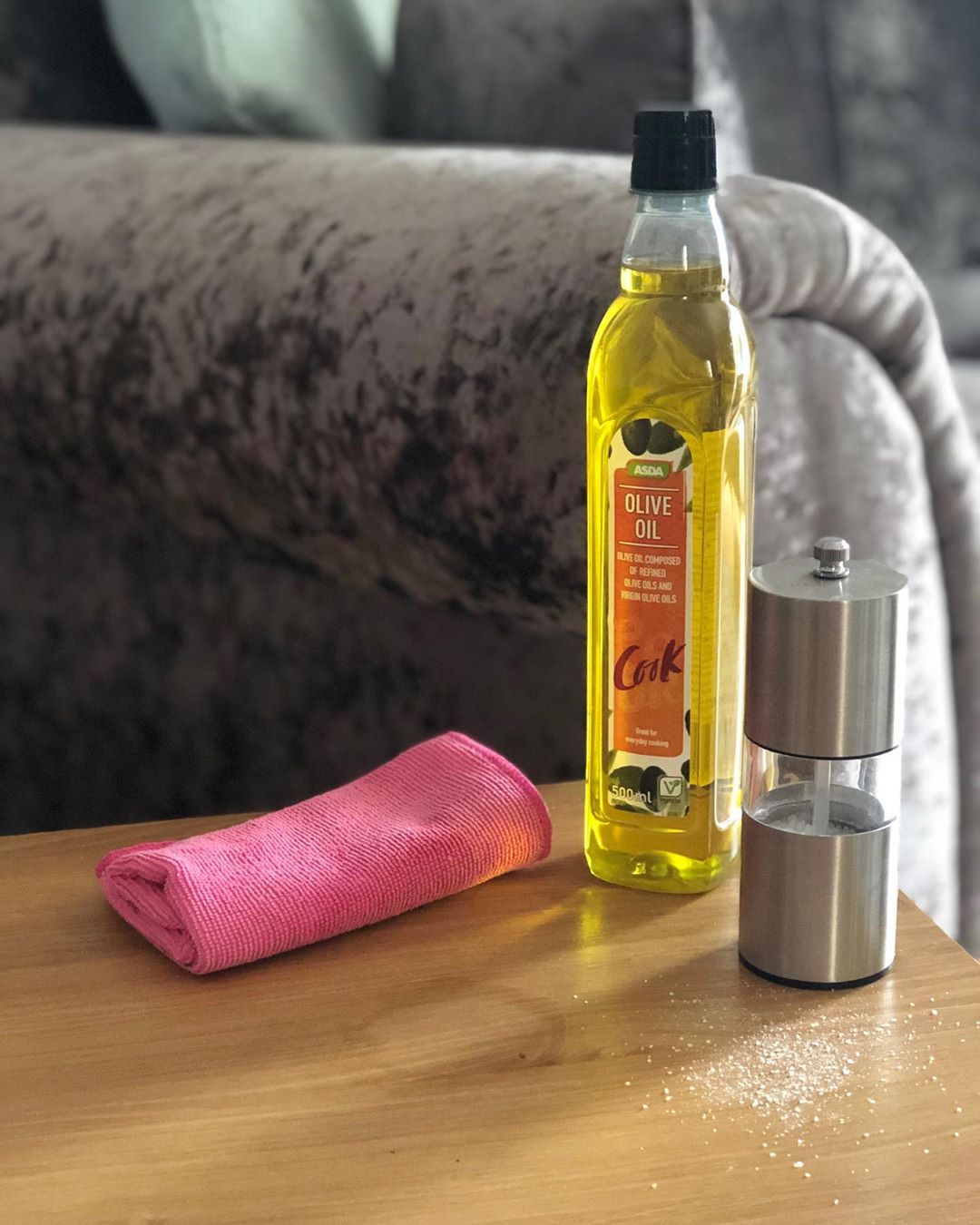 روغن زیتون و نمک را در کاسه ای مخلوط کنید و با یک دستمال میکروفایبر مهسان به قسمت آسیب دیده بزنید. 30 دقیقه صبر کنید سپس آن را پاک کنید.