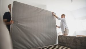 وقتی به محل استقرار تشک رسیدید، تسمه ها و طناب رو بردارید و آروم روی مقوای تمیز یا یک سطح صاف روی زمین قرارش بدید. اگه برای حمل و نقل تشک به تنهایی راحت نیستید، فردی رو استخدام کنید.