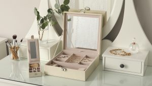 جعبه ی جواهرات به عنوان آینه ای که قراره روی میز قرار بگیره و جمع و جور باشه، این نوع آینه ها همیشه کاربردی هستن، تا هم زیورآلات ما رو توی خودشون جا بدن و هم آینه ای باشن که گاهی بهش نیاز خواهیم داشت.